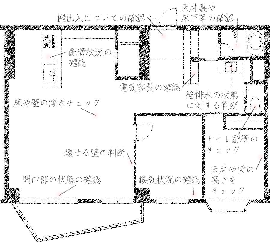 例えば、壊したい壁が実際に壊せるかどうか、給湯器や分電盤などがそのまま使えるか、断熱や構造の状態に問題がないかなど、リノベーションにあたって必要な要素を内見時に判断できると今後の可能性が広がります。