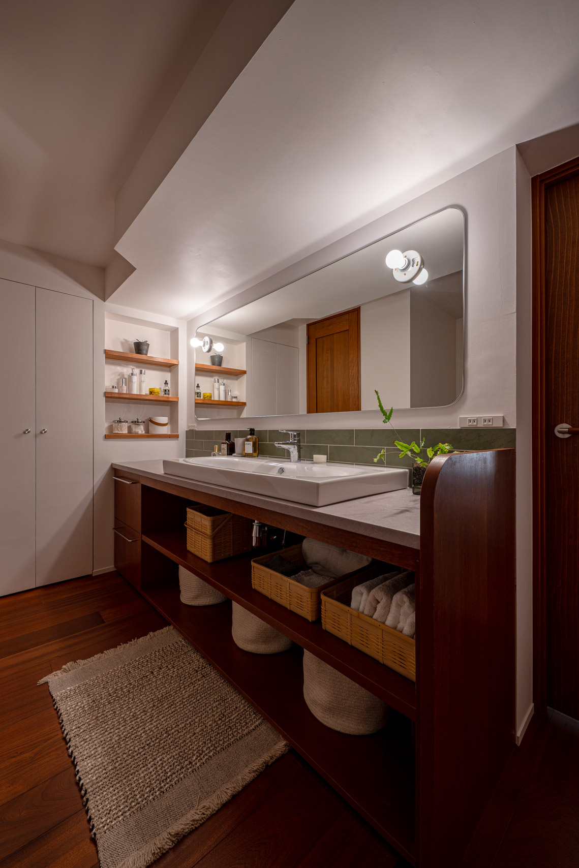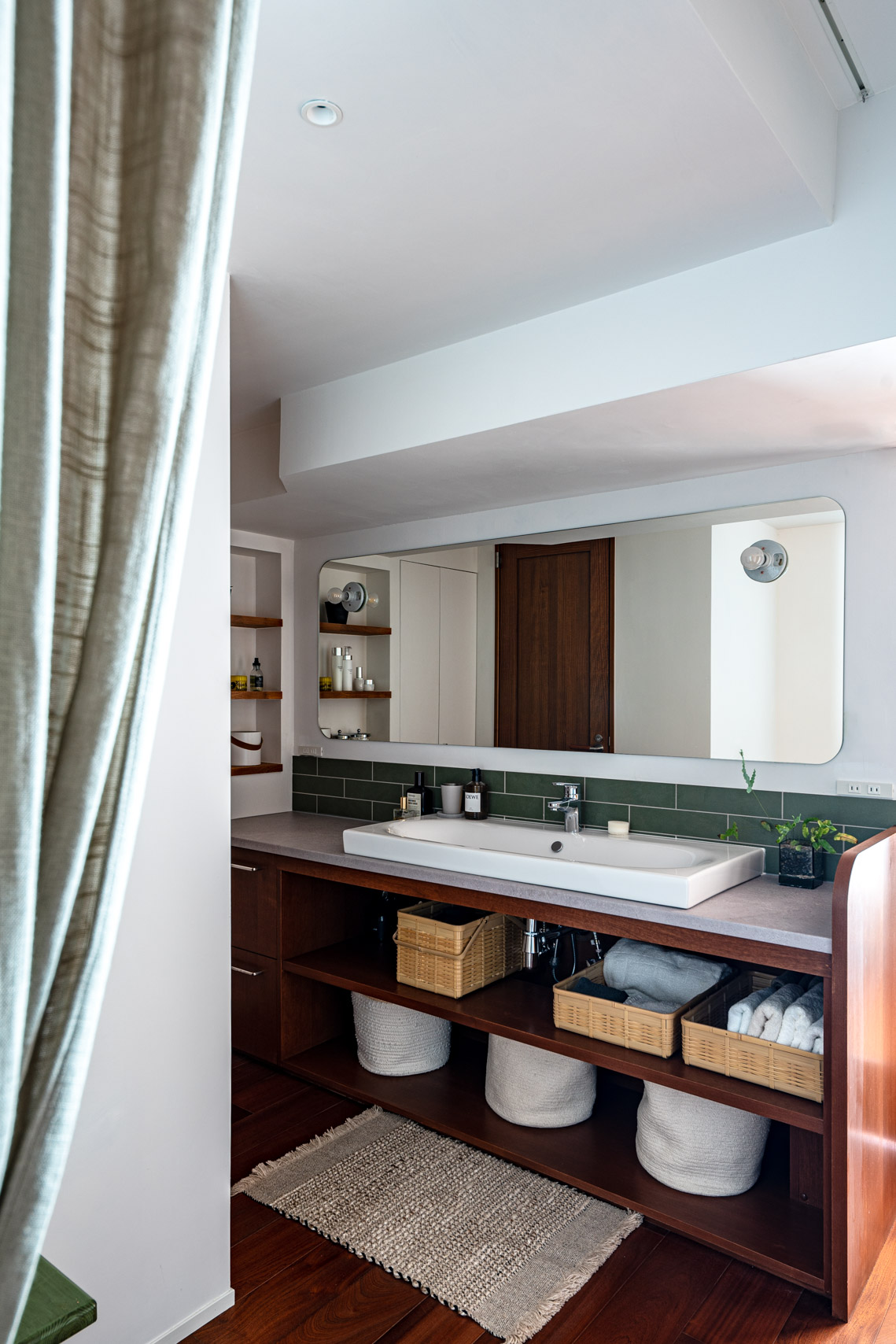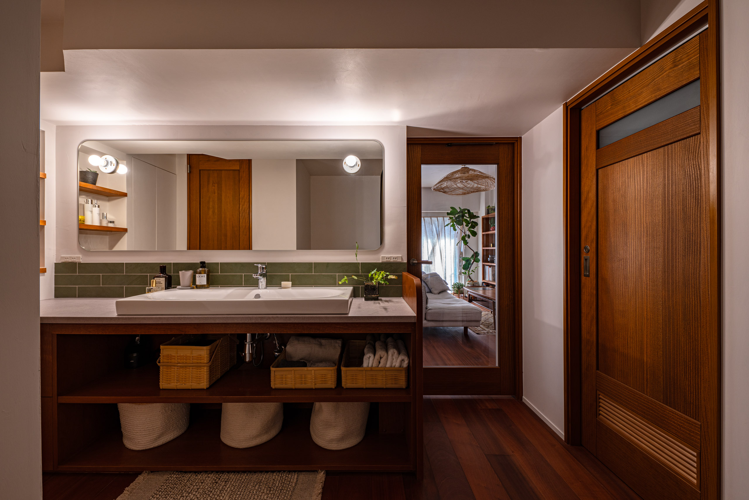 幅2mを超える大きな洗面カウンターに合わせて、大きな鏡を設置。角を丸めることで柔らかな印象となりました。また、正面3段のみ薄いグリーンのタイルを張り、重厚な木の雰囲気との調和を図りました。