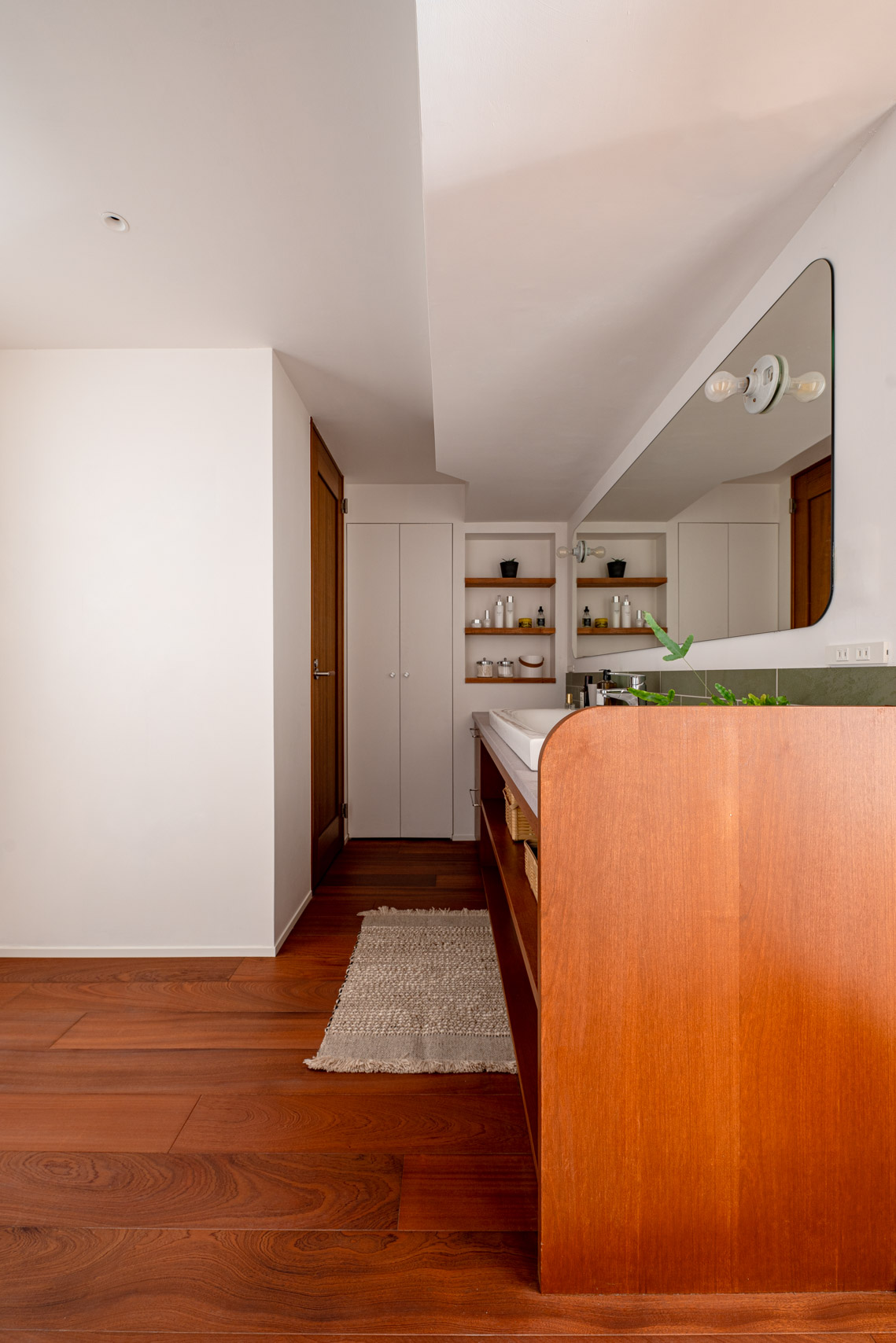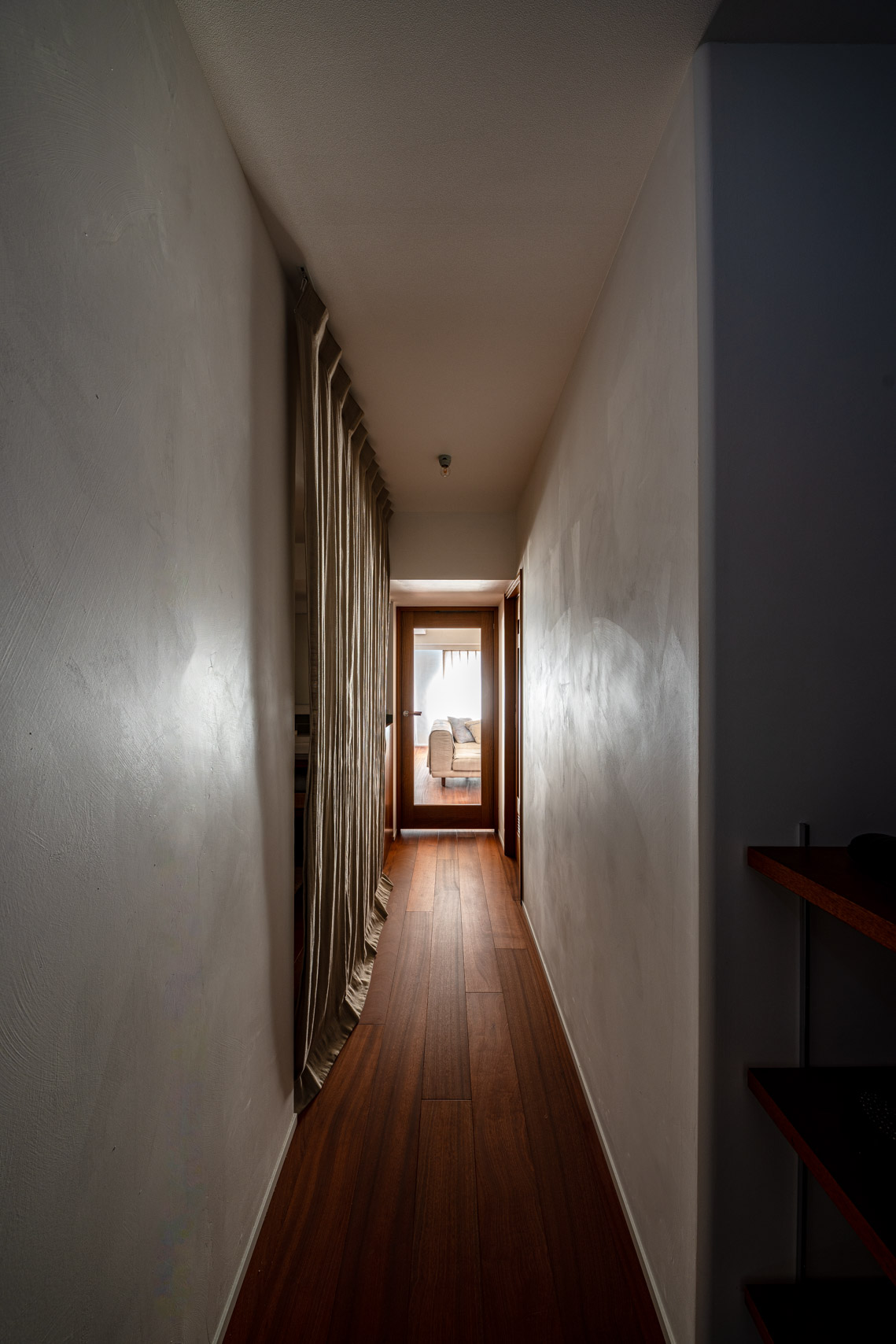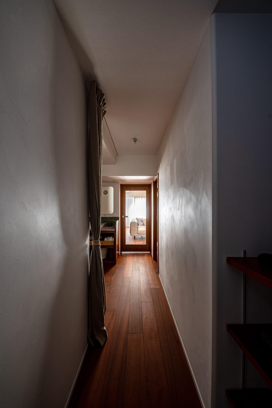 壁を動かせない制約の中で快適な洗面スペースを確保するため、廊下に連続したサニタリーを設けました。