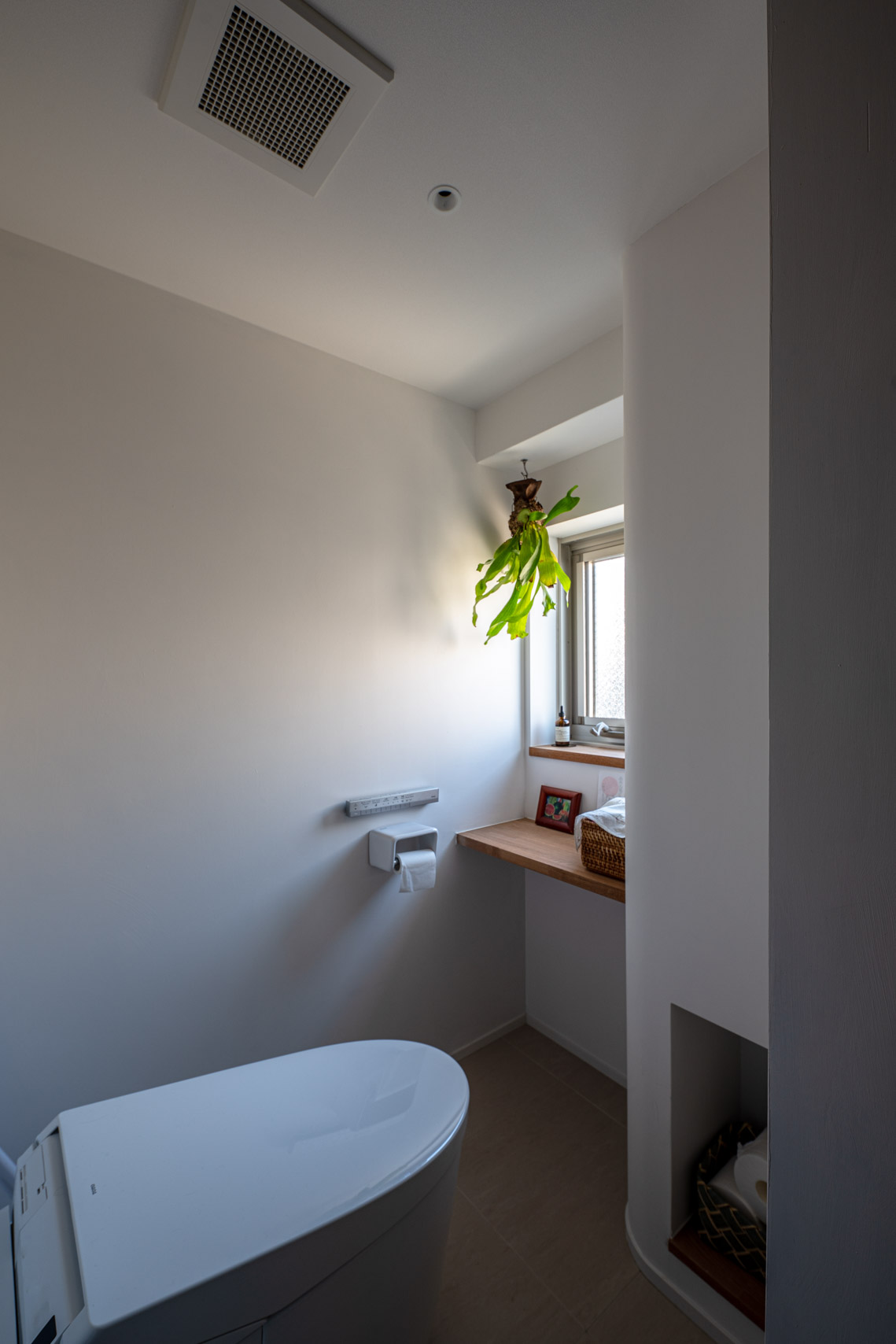 サニタリーからアクセスできるトイレは北側の窓に面し、優しい光で満たされています。右側、R形状の柱型には換気扇のダクトを納めています。下部はデッドスペースなので、ニッチ状の収納とて利用。