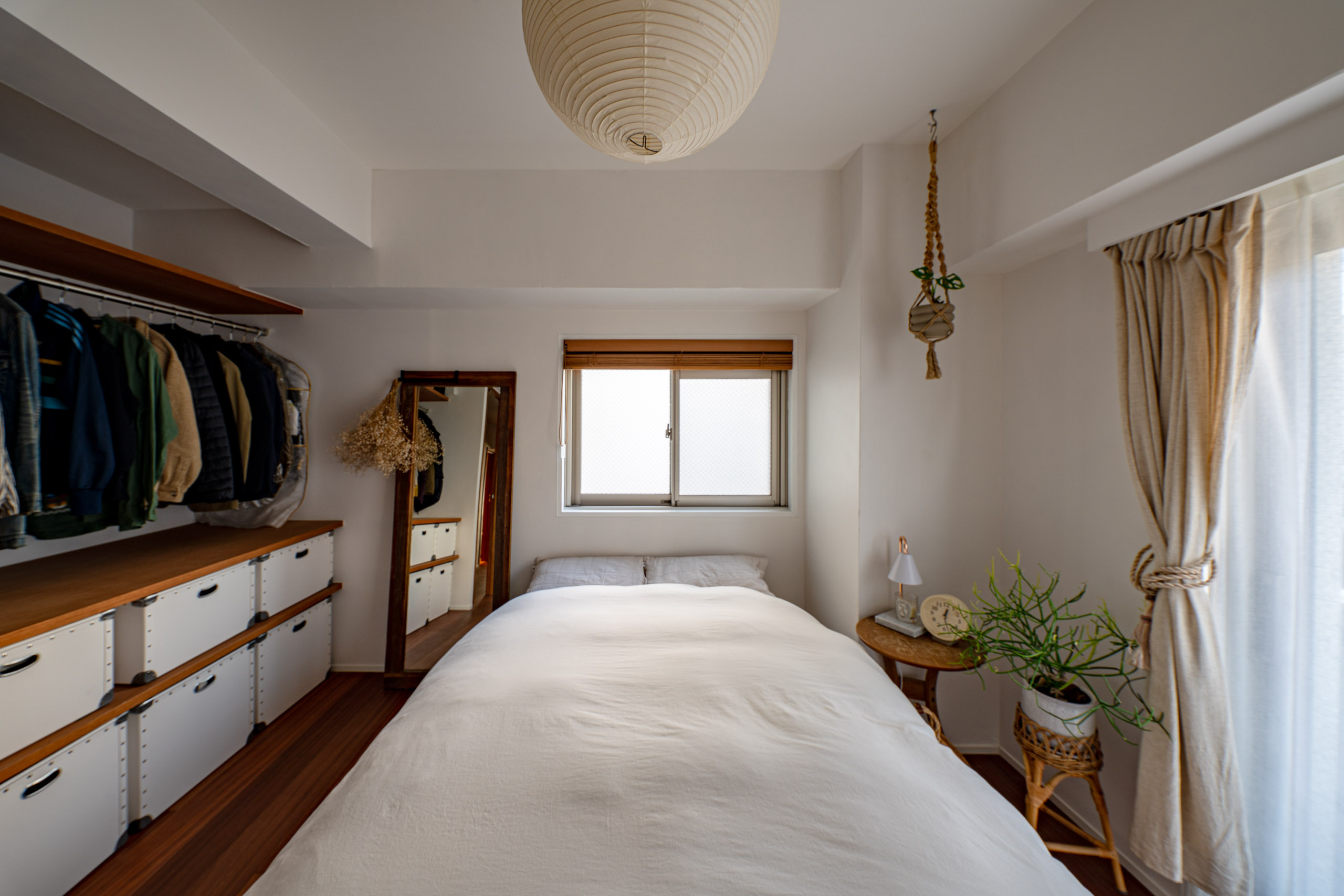 天床高さいっぱいのカーテンの存在感はありつつ、ノイズが少ないので、すっきりとした印象です。