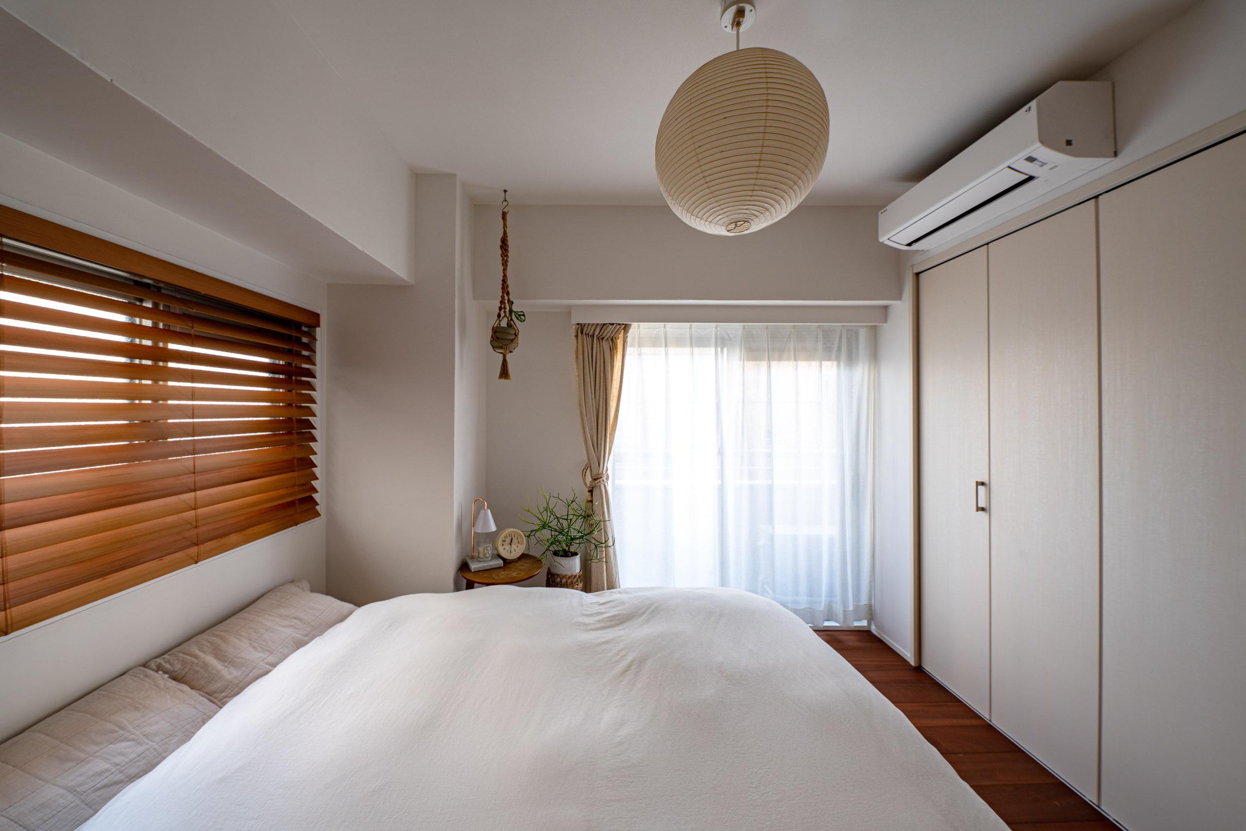 北東側には6枚折戸のクローゼットを設置。梁型に合わせ下がり壁を設けていますが、エアコンの設置スペースとして利用しています。エアコンの配管はクローゼット内部に隠蔽し、サービスバルコニーに置いた室外機に接続しているため、配管が見えず、すっきりした印象となっています。