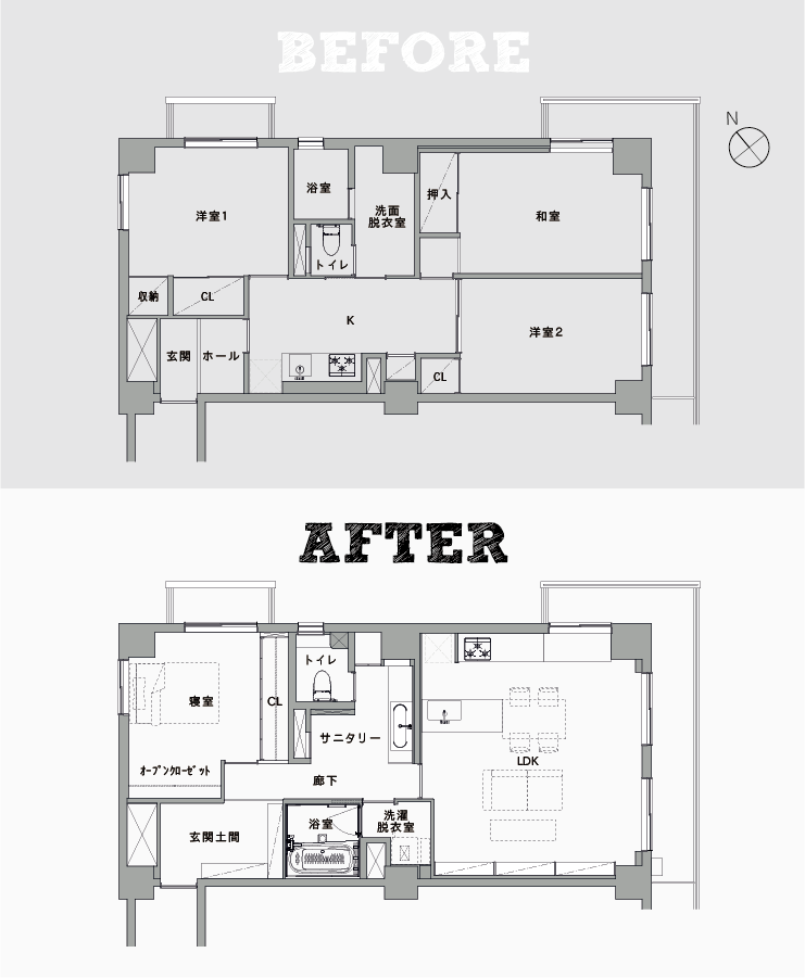 その中でも水廻りを大きく動かし、LDKを明るく風通しの良い南側へ設けること、開放的な間取りへ更新することに重きを置き、設計を進めました。